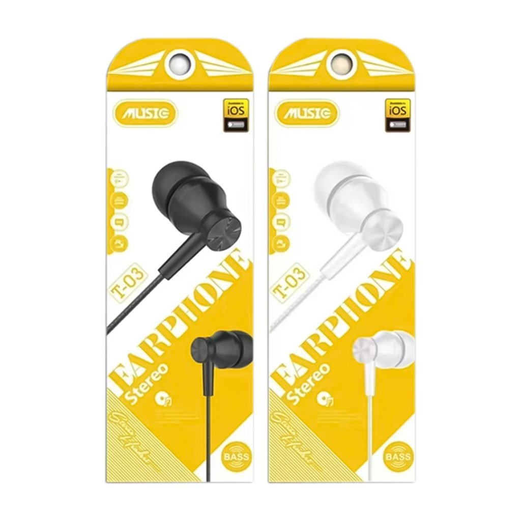 El audífono de cable estéreo T-03 combina un diseño ergonómico con materiales de alta calidad para garantizar una experiencia auditiva placentera. Su estructura ligera permite un uso prolongado sin incomodidades, ideal para largas sesiones de escucha.
